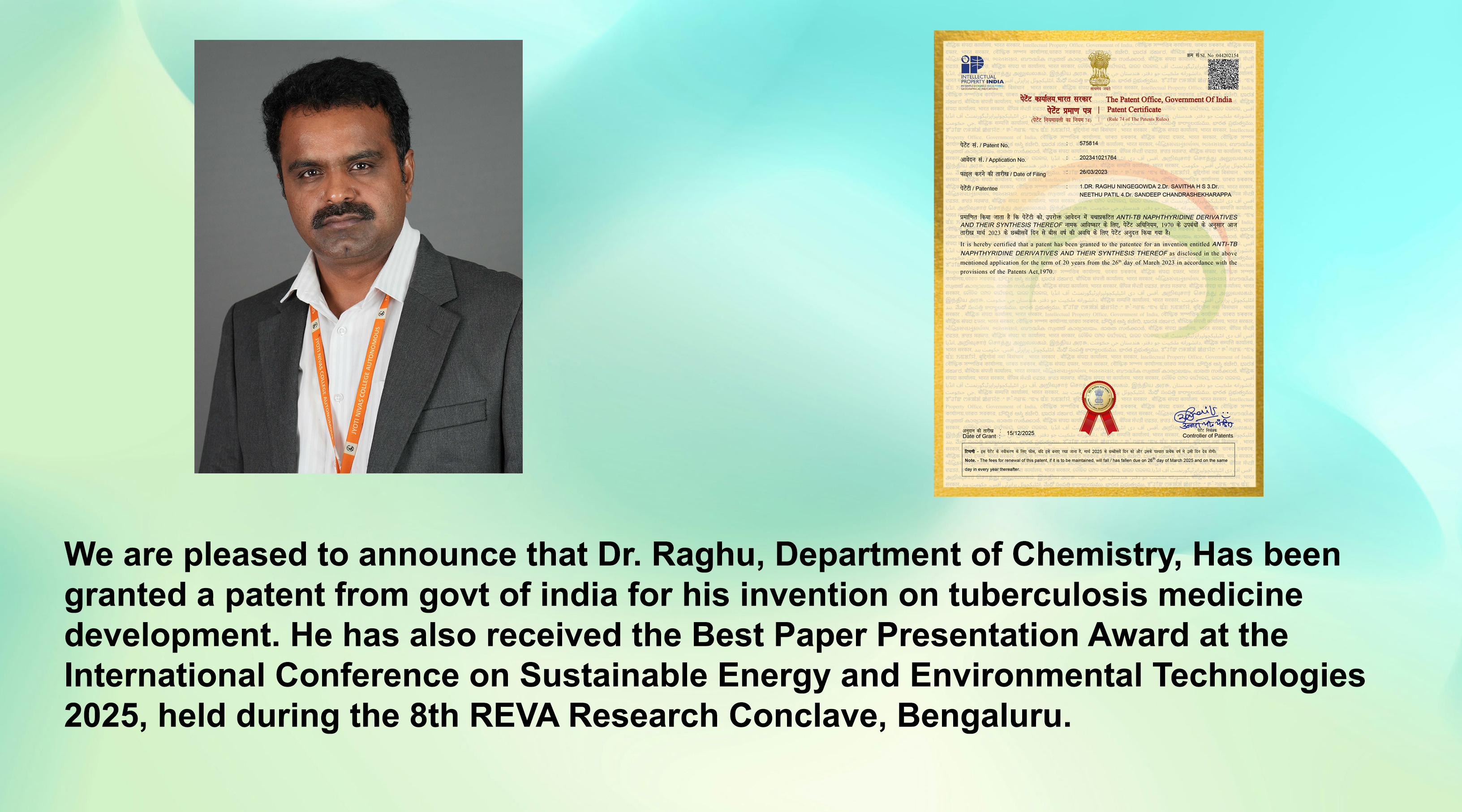 Research Excellence at Jyoti Nivas College Autonomous: Dr. Raghu Has Granted a Patent & Best Paper Award