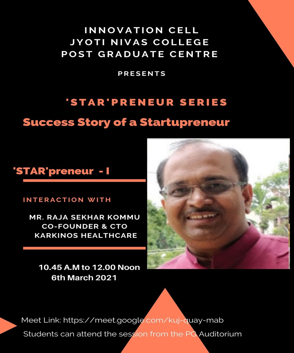 The STARPRENEUR SERIES – Success Story of a Startupreneur was organised by the Innovation Cell of Jyoti Nivas College Post Graduate Centre on 6th March 2021. The session was held on both offline i.e., in the college and online platform, Google meet from 10:45 a.m. – 12:00 p.m. with ‘STAR’Preneur -1, Mr. Raja Sekhar Kommu, Co- Founder & CTO Karnikos Healthcare. Approximately 150 participants benefitted the session.